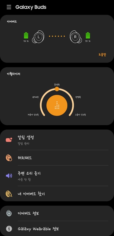 하단에는 이번에 버즈 플러스를 커넥팅 한 웨어러블 어플 실행화면이니 한번 달라진 점을 비교해 보세요.