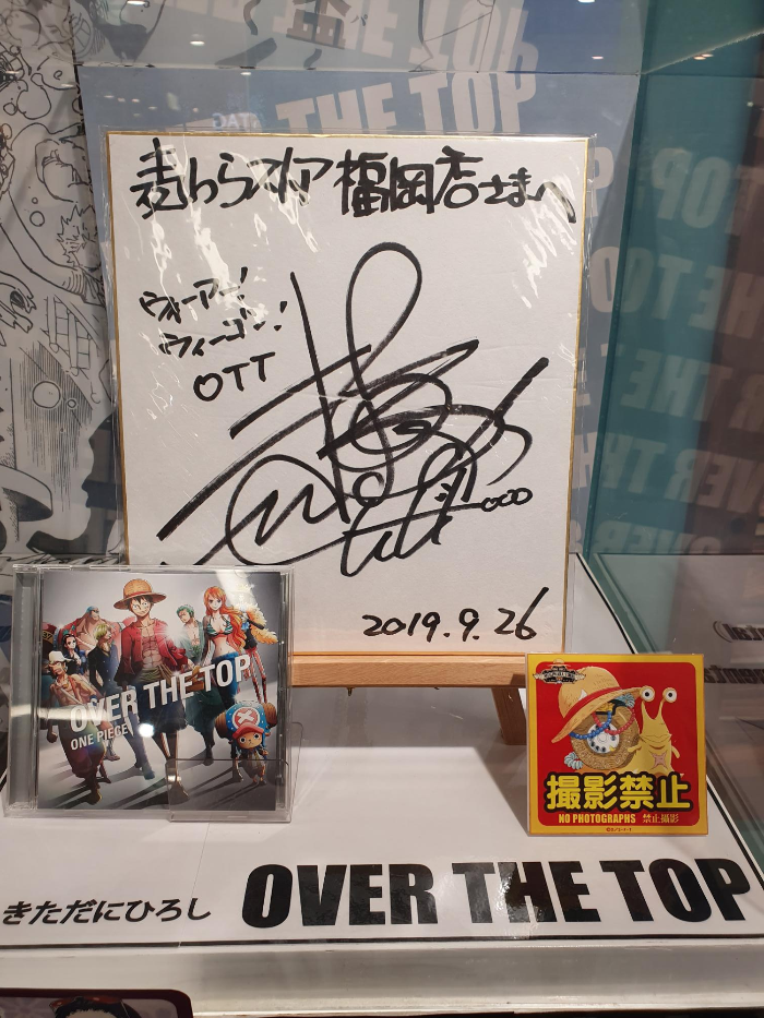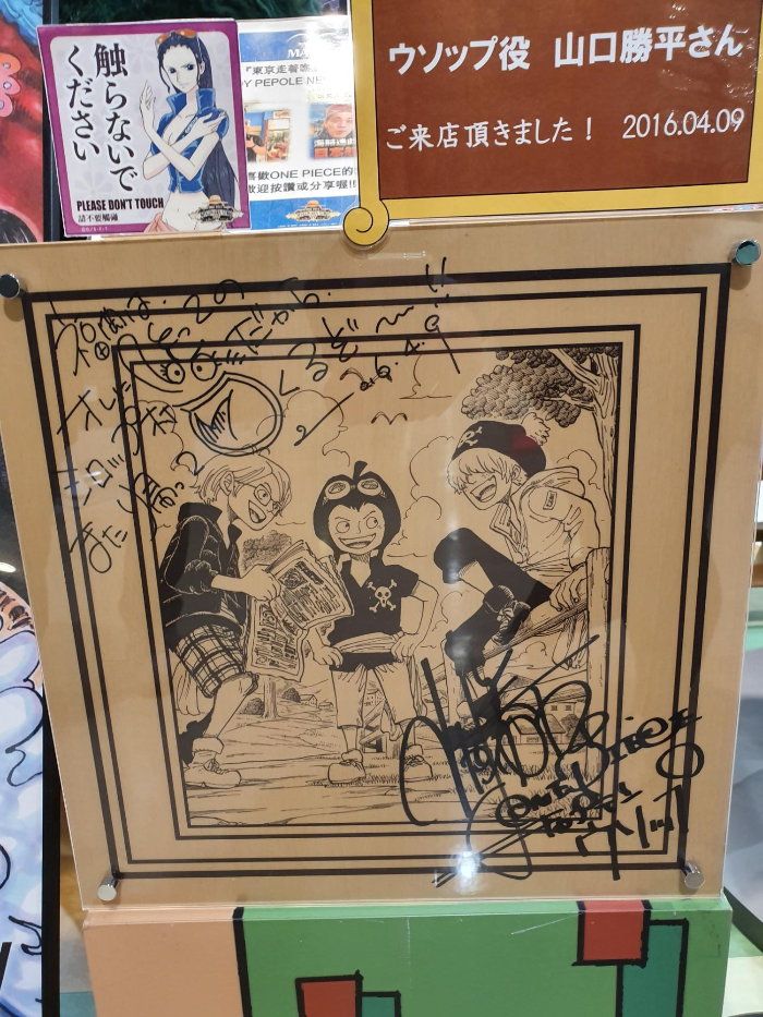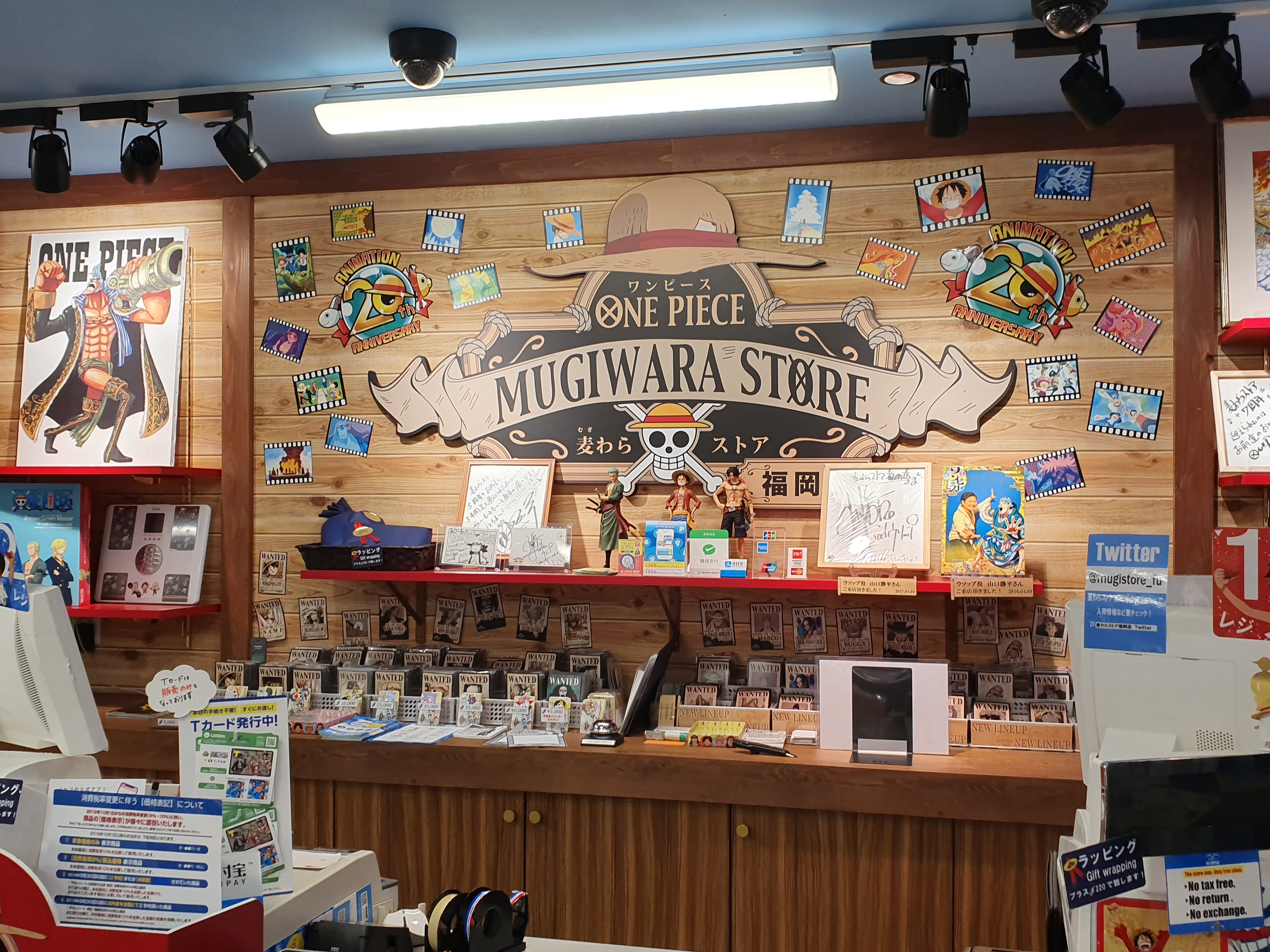 무기와라 스토어의 계산대에 점원이 안 계시는 순간을 사진에 담아보았습니다. 벽면에 가득한 원피스 애니메이션 장면과 여러 유명인들의 사인이 원피스의 인기를 실감케 하네요.