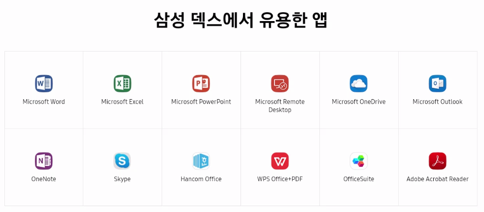 아래 앱 리스트를 살펴보면 좀 더 문서작업이나 회의 등 회사생활에서 필요로 하는 앱들이 대다수인 것을 알 수 있습니다. 저는 회사로 출근하는 직종이 아니라서 유용하게 사용할 수 있을지 미지수지만 아래 앱들을 많이 사용하는 분들에게는 희소식이 될 수 있을 것 같네요. 잘 활용해서 유용하게 사용하시면 좋을 것 같은 덱스 프로그램입니다.