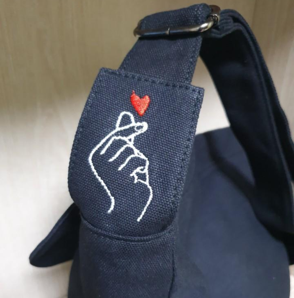 가방의 끈과 몸통이 연결되는 접합부에는 아래와 같이 한국식 하트라 수놓아져 있어요.