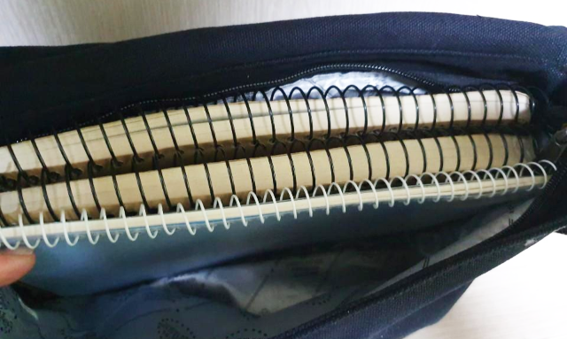 아래가 무지 스프링 노트를 여러 권 넣고 상단에서 찍어봤어요. 가방 위로 튀어나오지 않으면서 가방 사이즈에 딱 맞게 들어갑니다. 제법 두꺼운 노트를 넣었음에도 앞쪽으로 공간이 많이 남아 있어서 안에 꽤 공간이 넓다는 걸 알 수 있어요.